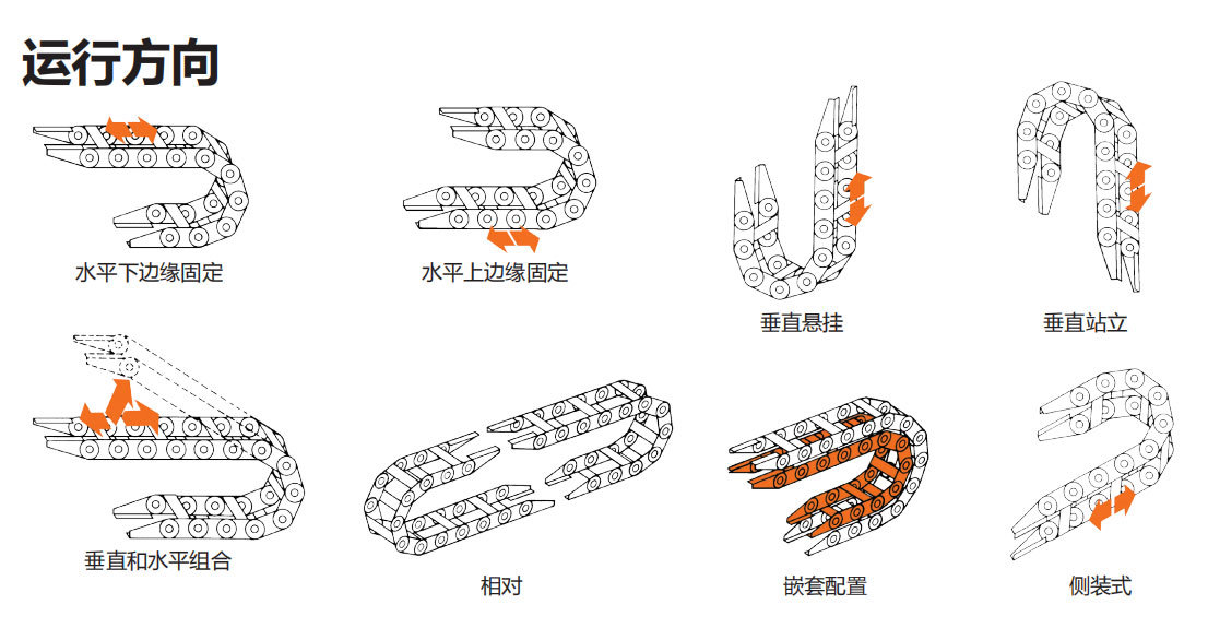 每个拖链都有一个无支撑的跨度。这一跨度是连接结构的一个条件,以及所承载的电缆和软管的全部重量。当拖链的无支撑跨距超过时,拖链开始下垂。当拖链ll重量超过其自由承载长度时,Dynatect将建议适当的支撑引导。有关负荷图,请参阅系列规格。
