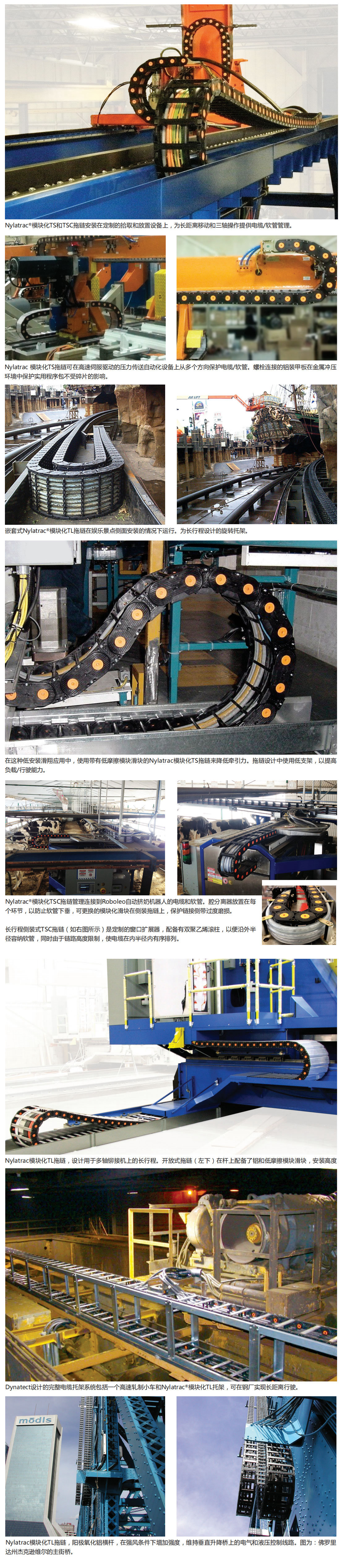 Dynatect提供塑料、金属和混合拖链,以满足最广泛的应用。一般情况下,在工作温度升高或重载超过塑料拖链的最大无支撑行程时,使用Gortrac钢制拖链并低速运行;总之,通过控制加速和减速,可以实现更高的速度。在需要更高速度、加速度和长距离行驶的应用中,塑料载体通常是首选。